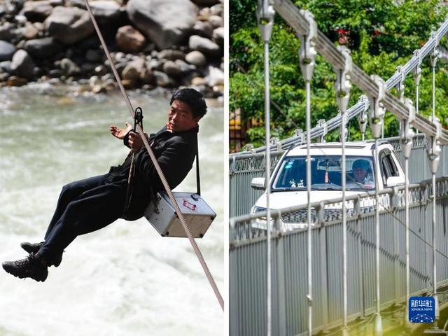 这是一张拼版照片:左图为2011年2月20日,“溜索医生”邓前堆在怒江州福贡县石月亮乡拉马底村溜索到江对岸出诊(新华社记者秦晴摄)。右图为2022年9月14日,邓前堆出诊归来驾驶私家车过桥(新华社记者江文耀摄)。新华社发