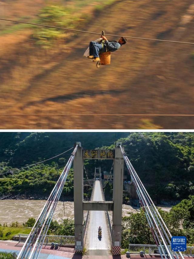 这是一张拼版照片:上图为2013年2月2日,在云南省怒江州泸水市六库街道,一名居民背着背篓溜索过江(新华社记者王长山摄)。下图为2022年9月13日,泸水市居民骑摩托车通过大兴地桥(无人机照片,新华社记者江文耀摄)。新华社发