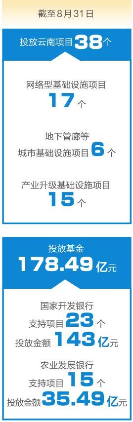 据人行昆明中支相关负责人介绍,此次金融工具主要支持中央财经委员会明确的五大基础设施重点领域。获得工具支持的38个项目中,网络型基础设施项目17个,其中,交通项目8个、投放金额141.9亿元,水利项目9个、投放金额17亿元;地下管廊等城市基础设施项目6个、投放金额2.35亿元,其中,5个为老旧小区改造,投放金额1.59亿元;产业升级基础设施项目15个、投放金额17.22亿元。金融工具支持的全国首单水库扩建和保障性安居工程项目均落地云南,普洱市宁洱哈尼族彝族自治县老旧小区改造项目获得农发行系统全国首笔保障性安居工程基金2500万元支持;弥勒市老旧小区改造项目获得了国开行系统全国首单保障性安居工程领域基金投放。