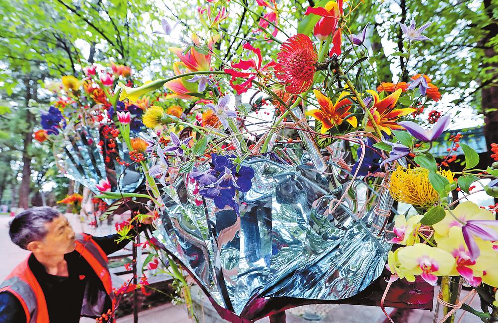 近日,2022年昆明市职业技能竞赛绿化工、插花员竞赛暨第六届昆明市名匠杯职业技能竞赛在大观公园开赛。赛事共吸引36个单位的160名选手参与。图为插花参赛优秀作品在公园内进行展览。(云南日报 记者杨峥)