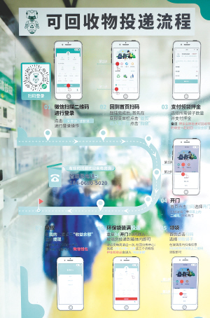 居民只需购买一个专用环保袋,用手机微信扫码与该环保袋二维码绑定,通过微信小程序扫码开门进入“固废兑换银行”放置固体废弃物环保袋。第三方专业公司工作人员将定期到“固废兑换银行”对固体废弃物称重、按类别单价回收,以微信小程序付费给居民。