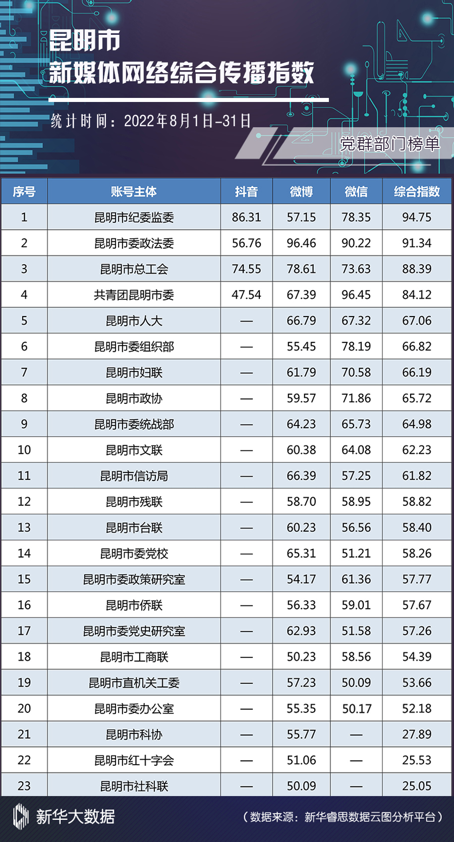 榜单中,昆明市委政法委抖音首次纳入监测;昆明市纪委监委抖音月度数据排名首位,月度点赞数、转发数、评论数都较高;昆明市总工会发布的“致匠人”系列内容在8月阅读、互动数据方面继续保持增长,其中“彝族(撒尼)刺绣”“绞胎炻器”“中国结”内容都得到网友关注和评论。微博平台中,昆明市委政法委在信息发布和网络互动的6个指标中都排名靠前。在微信平台中,共青团昆明市委月度阅读量超过20万,其中8月21日发布的《昆明市青少年心理健康服务中心预约操作指南都在这里,详情请戳》阅读量超过3万;昆明市委政法委、昆明市纪委监委、昆明市委组织部月度阅读量也超10万。