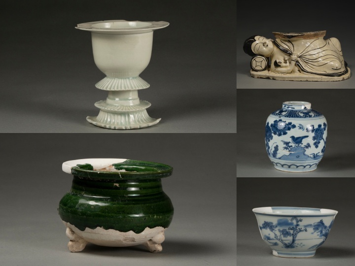 图为州桥遗址出土文物。从左往右、从上往下依次为北宋青白瓷熏炉、金低温绿釉炉、元白地黑花瓷枕、明青花花卉纹罐、清风景纹杯(州桥遗址考古队供图)