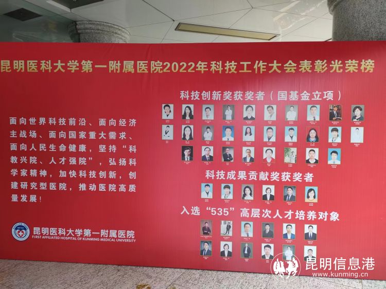 会上,医院宣读了《昆医大附一院关于表彰2022年度在科技工作中做出突出成绩的人员和团队的决定》、《昆医大附一院关于入选2022年第一批“535”高层次人才培养对象的通知》,并颁发奖状及证书。