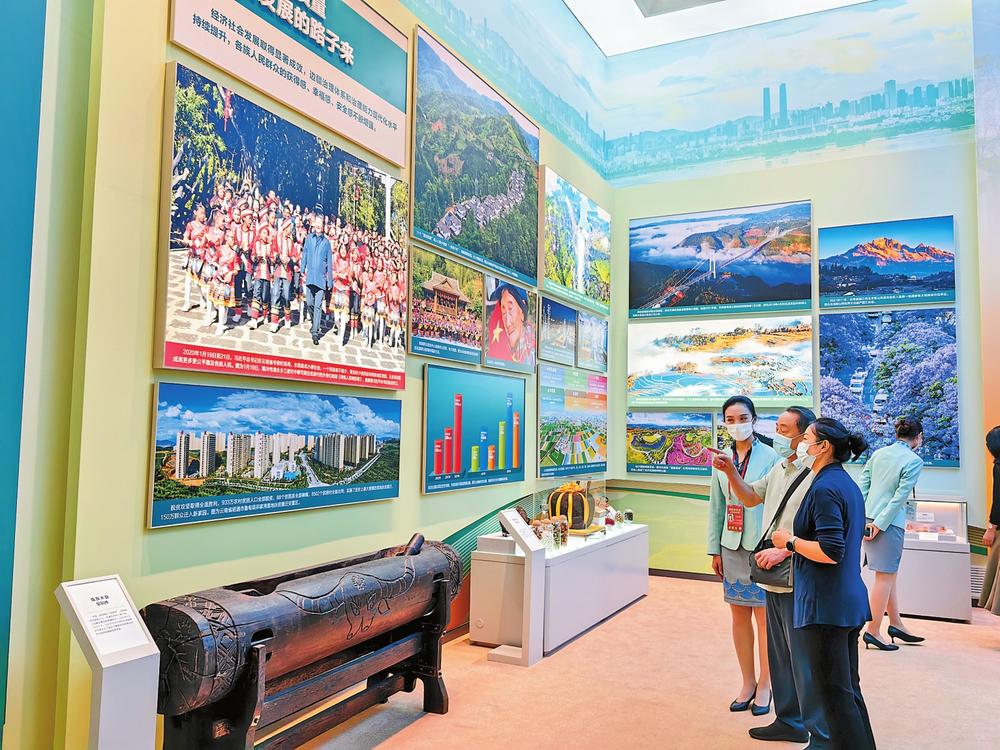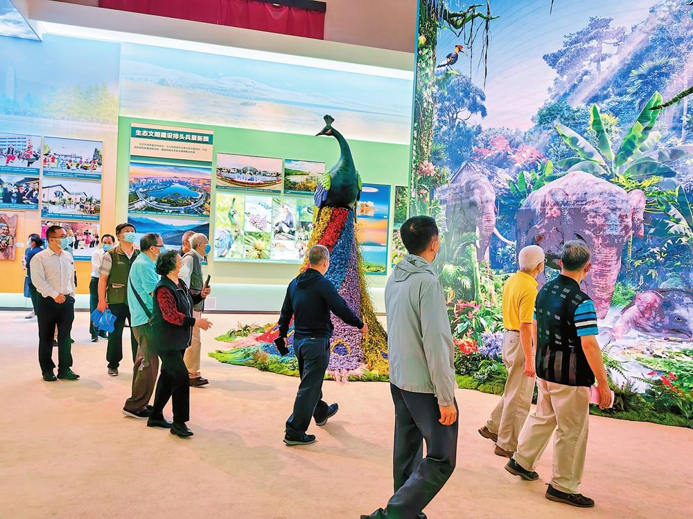 在“坚持人与自然和谐共生 美丽中国建设迈出重大步伐”单元,苍山洱海国家级自然保护区、COP15第一阶段会议现场、野生亚洲象北迁南归等图文展板,让大家对云南推进生态文明建设排头兵有了更直观、深刻的认识。在“坚持推动构建人类命运共同体 开创中国特色大国外交新局面”单元,中老铁路动车交付的图文展板与下方“澜沧号”动车模型相得益彰,正是有了中老铁路,昆明到万象实现了朝发夕至,从此山不再高,水不再长。