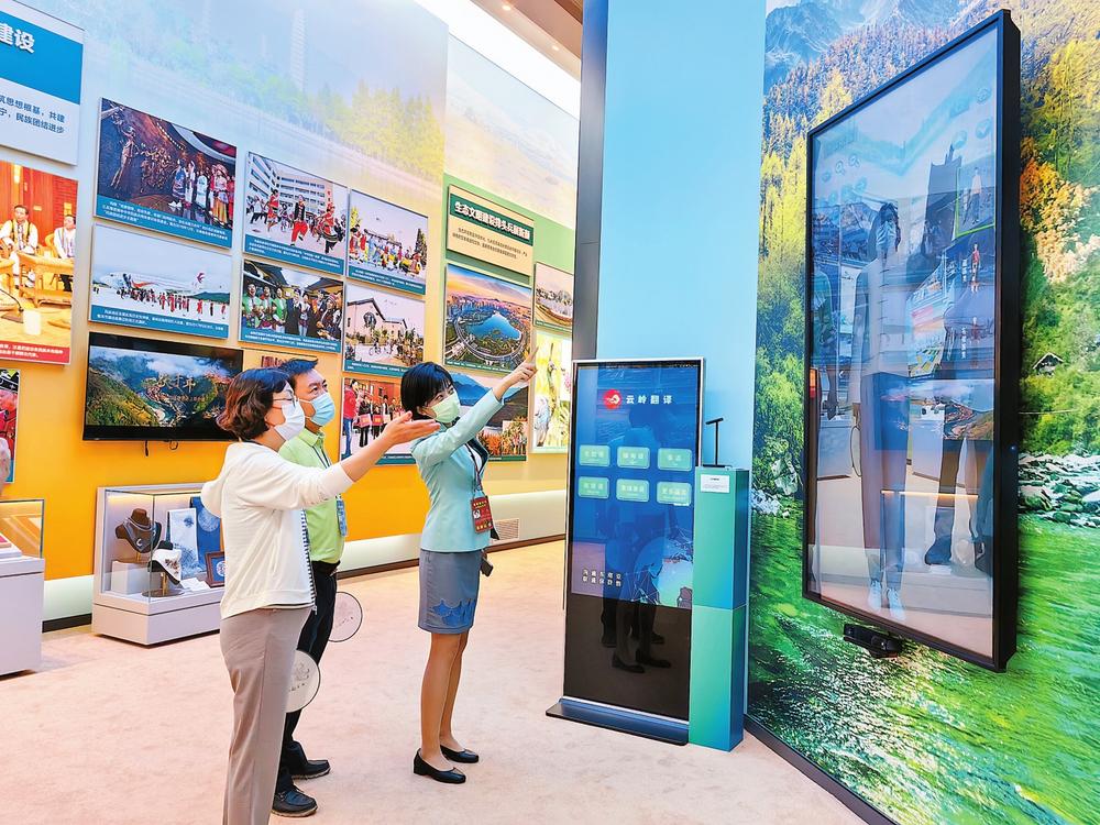 为更好展示七彩云南、提升观展效果,主题成就展云南展览办及策展团队精心策划,重点推出佤族木鼓、鲜花孔雀等实物、模型,裸眼3D视频大象迎宾、洱海之变等多媒体视频,AI换装、云岭翻译等互动展项,在有限的空间合理布置,有机搭配彰显特色。
