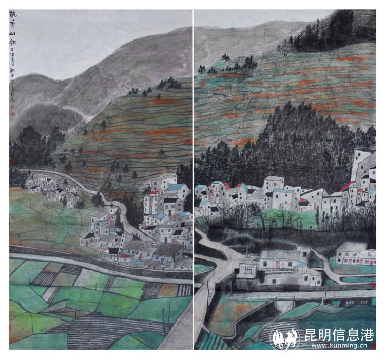 其中,董桃平的中国画《毓秀山乡》,取景家乡富源县的美丽乡村,在这片肥沃的红土地上,绿水青山春意盎然。董桃平用画笔把身边最熟悉的景色描绘出来,表达了对祖国繁荣富强欣欣向荣新农村景象的赞美和对这片土地的深深热爱。