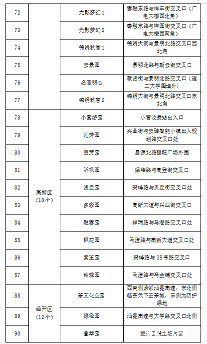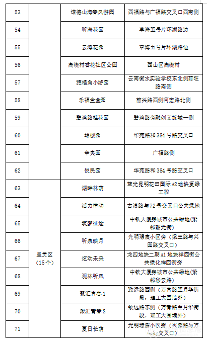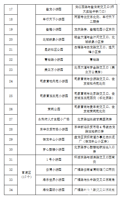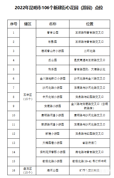 为加紧构建“园在城中,城在园中,城园相融”的现代公园城市格局,谱写绿美昆明建设新篇章。2022年,昆明在全市范围内打造的106个街心花园(游园)包括:盘龙区15个、五华区15个、西山区15个、官渡区17个、呈贡区15个、高新区10个、经开区12个、滇池度假区7个。一个个漂亮的街心花园(游园),既提升了城市的颜值,也增强了昆明市民的幸福感。