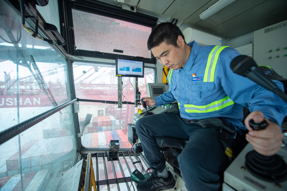 2022年5月24日,竺士杰在浙江宁波市北仑区穿山港区港口桥吊上作业。新华社记者 江汉 摄