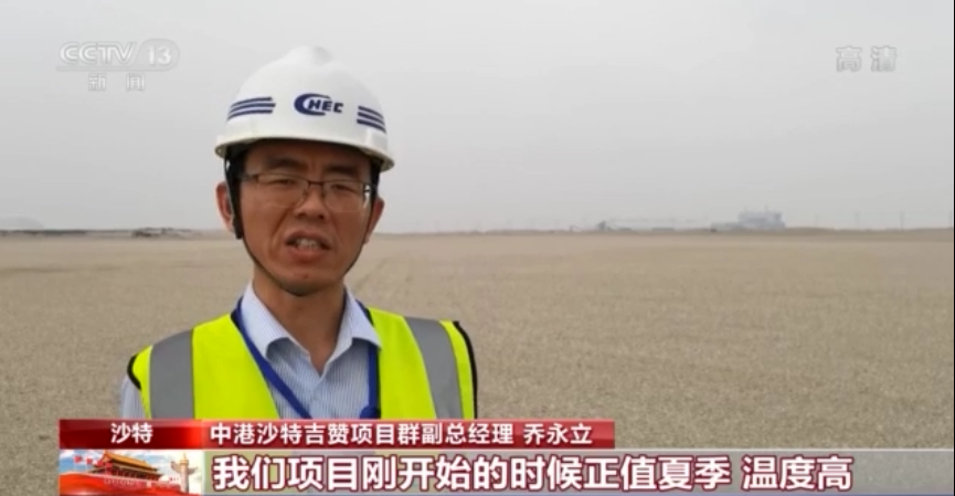 中港沙特吉赞项目群副总经理 乔永立:我们项目刚开始的时候正值夏季,温度高,又经常赶上沙尘暴,每天浑身都是沙尘和汗水的混合物,虽然我们做好了防护,全副武装,但是每天耳朵和鼻子里面还是灌进去很多沙子。