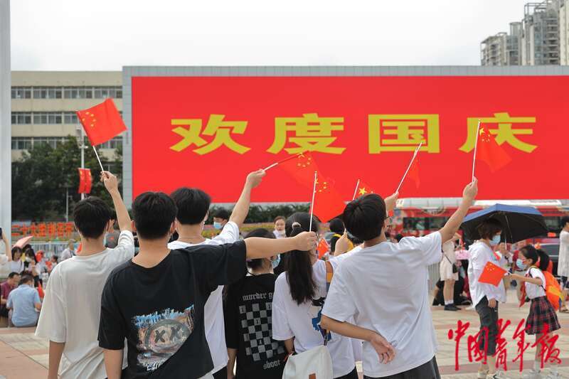 10月1日,广西南宁市民族广场,几名年轻人手舞国旗在写有“欢度国庆”字样的电子屏前留影。 中青报·中青网记者 谢洋/摄