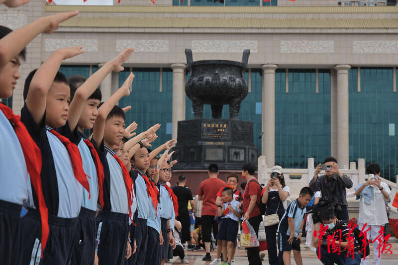 10月1日,广西南宁市衡阳路小学的学生们在民族广场举行向国旗敬礼仪式,他们身后是中央人民政府为庆祝广西壮族自治区成立50周年赠送的民族团结宝鼎。中青报·中青网记者 谢洋/摄