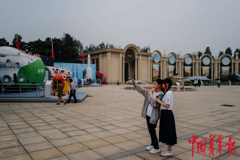 10月1日,北京展览馆,“奋进新时代”主题成就展在这里展出,两名女生在拍照留念。中青报·中青网记者 赵迪/摄