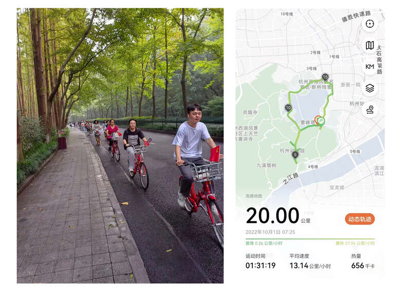 10月1日,杭州师范大学美术学院师生一起骑行“西湖玫瑰”活动,喜迎国庆节。他们身携红旗、用骑行轨迹在地图上画出朵朵玫瑰花,抒发爱国之情,体现了当代大学生的朝气和浪漫。钟江顺/摄(拼合图片)