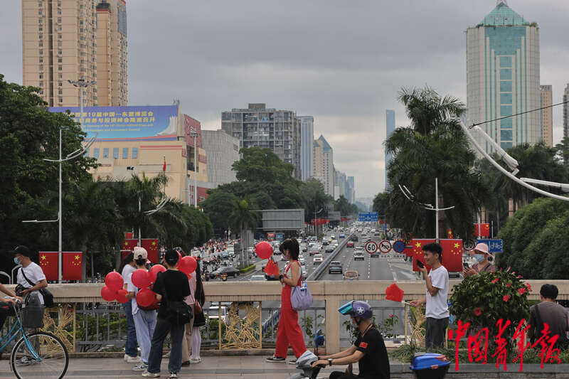10月1日,市民从新民立交桥走过,他们身后的民族大道上挂满国旗,国庆氛围浓厚。 中青报·中青网记者 谢洋/摄
