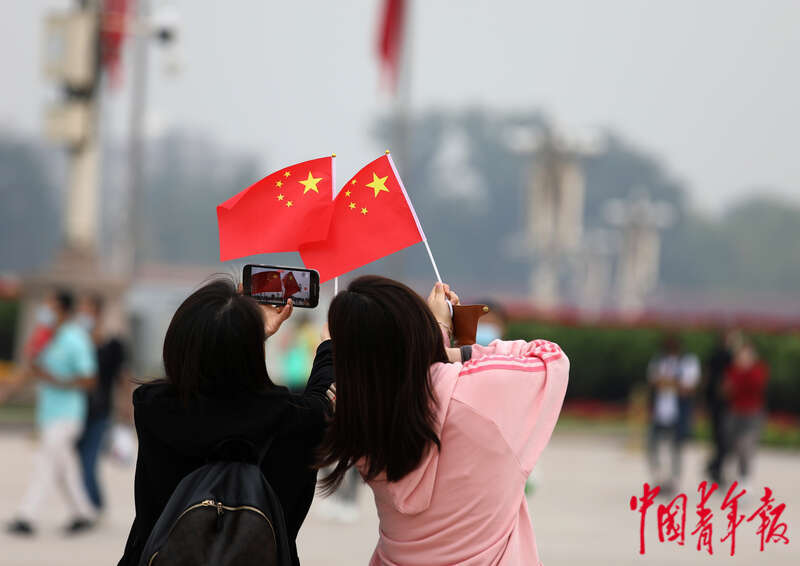 10月1日,北京天安门广场,两名年轻人将手中的国旗举向天空拍照。中青报·中青网记者 陈剑/摄