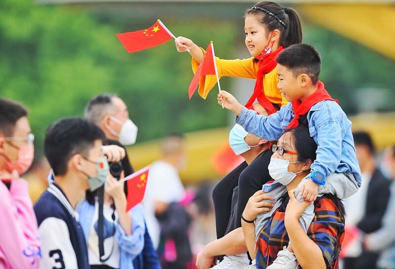 10月1日,四川成都天府广场,两名小朋友挥舞国旗庆祝国庆节。当日,成都天府广场举行升国旗仪式,庆祝中华人民共和国成立73周年。人民视觉供图