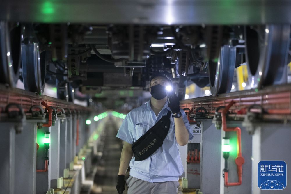 10月1日晚,在中国铁路哈尔滨局集团有限公司哈尔滨动车段检修车间内,动车组地勤机械师龚雨茁在进行检修作业。新华社记者 张涛 摄