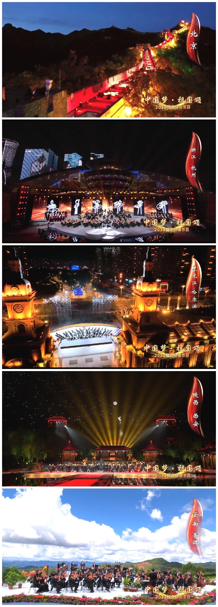 在《中国梦·祖国颂——2022国庆特别节目》中,五大交响乐团在北京、西安、杭州、哈尔滨、普洱五个城市实现多地联动,共同奏响《红旗颂》,描绘出一幅“江山如画”的壮美景象,引发观众的共情共鸣。网友称赞:“壮观!天南海北,普天同庆!”