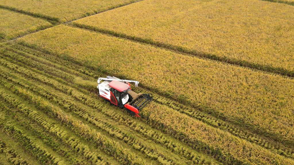 9月28日,合肥市肥西县花岗镇河丰社区村民驾驶收割机收获中稻(无人机照片)。新华社记者 刘军喜 摄