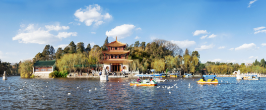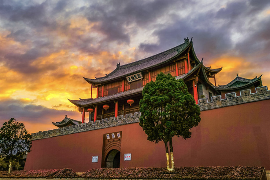 大观楼,位于云南省昆明市西山区大观路284号大观公园内,与中国主流传统建筑文化一脉相承,其中“五墨”彩绘及挑檐檩枋头木雕均为象头或花卉图形等,具有地方民族文化色彩,体现了中原文化与边疆民族文化的交融。