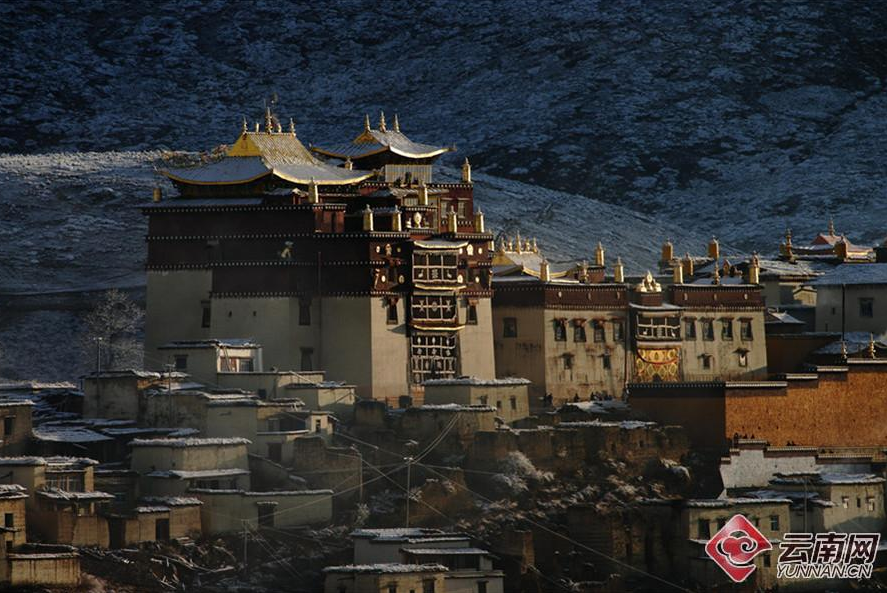 松赞林寺位于云南省迪庆藏族自治州。是一座古镇规模的古堡群建筑,寺院外围筑有椭圆形城垣,主殿威严而华美,殿内壁画色彩鲜艳,大寺坐北朝南,为五层藏式雕楼建筑。主殿上层镀金铜瓦,殿宇屋角兽吻飞檐,又具汉式寺庙建筑风格。
