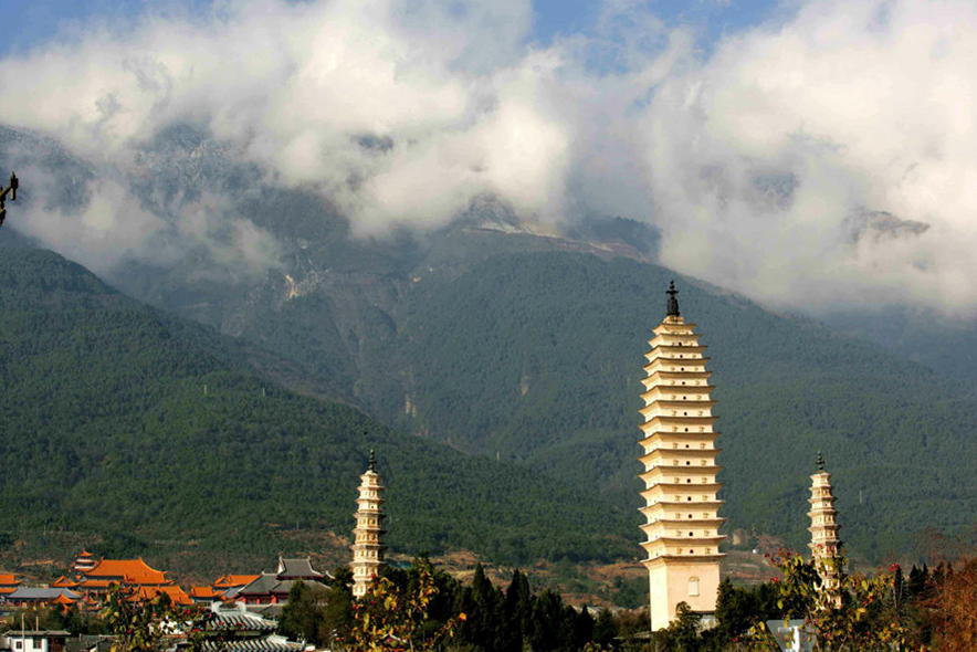 大理三塔位于云南省大理白族自治州。三塔之中先建了大塔“千寻塔”,高69.13米,是座方形密檐式砖塔,共16层。稍后又建了南、北小塔,均高42.19米,是一对八角形的砖塔。