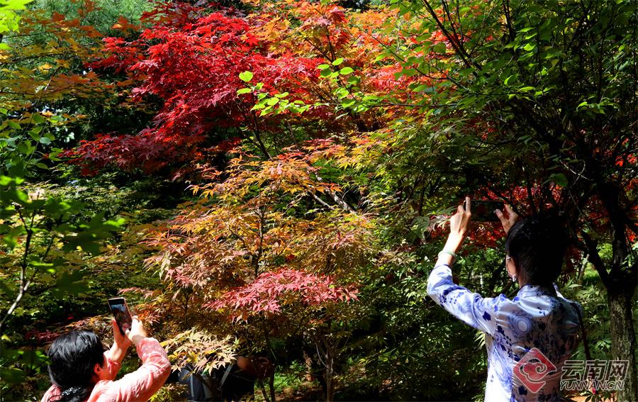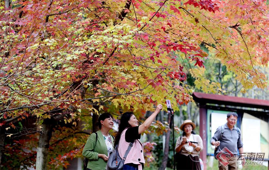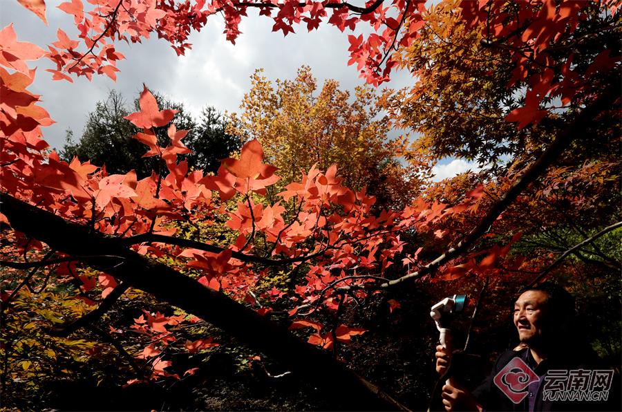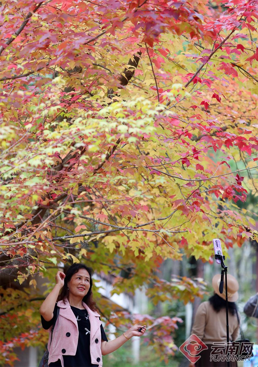10月4日,国庆假日与重阳佳节“喜相逢”,昆明黑龙潭公园的红枫景观也进入了最佳观赏期,枫香、槭树、红枫等观叶植物在阳光照射下黄得鲜亮、红得艳丽,让整个山岭层林尽染,呈现色彩斑斓、娇艳夺目的秋日美景。