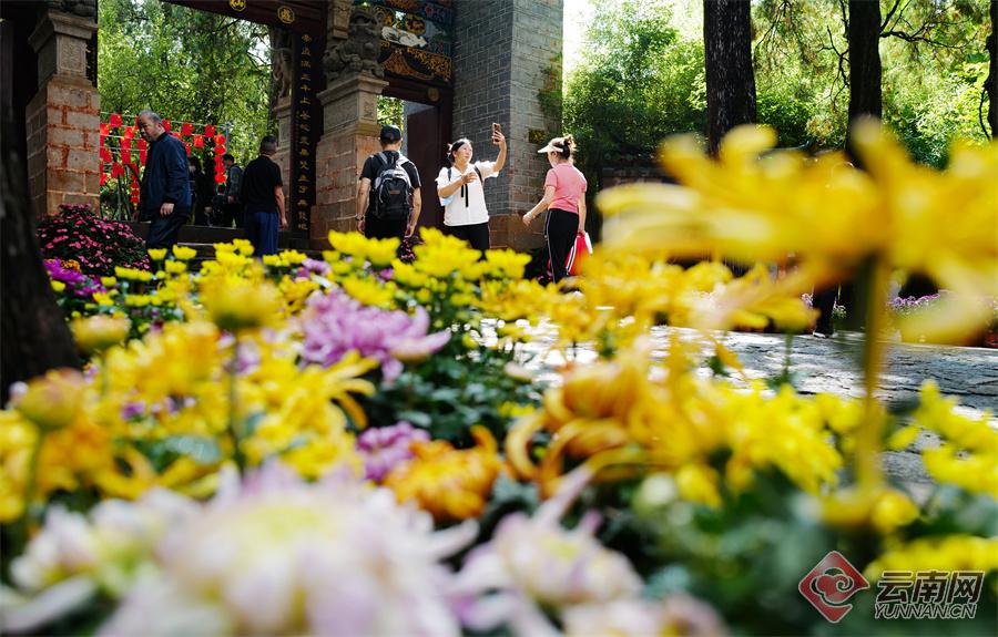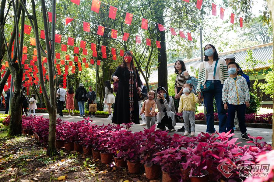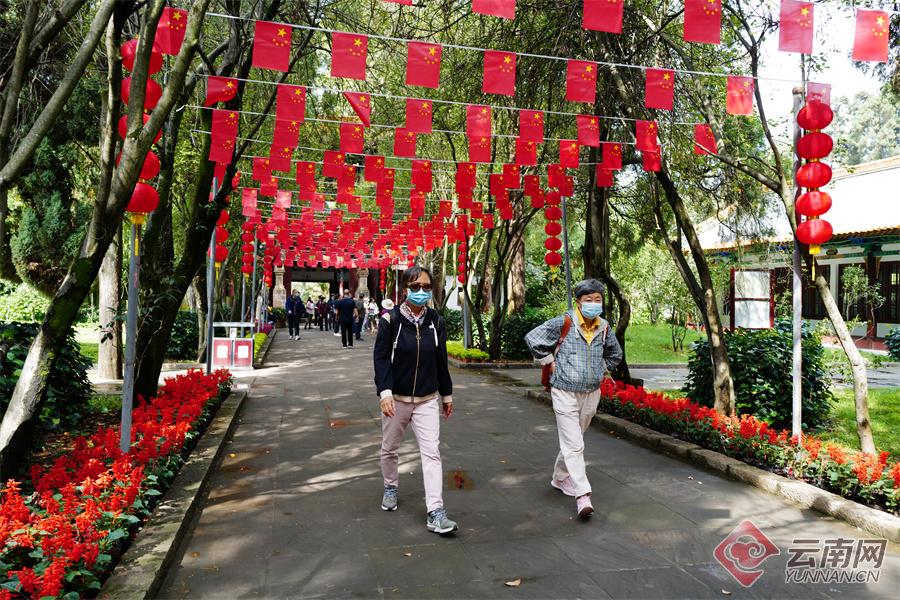 10月4日,昆明市金殿风景名胜区内国旗飘扬,彩菊盛放。国庆长假恰逢重阳节,不少市民携老扶幼来到景区登高祈福、秋游赏菊。在欢乐祥和的氛围中度过一个美好的假期。