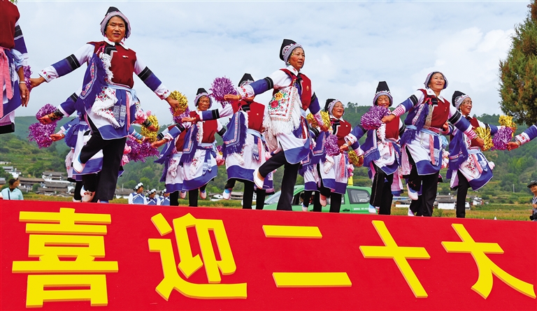 10月2日,在云南省丽江市玉龙纳西族自治县九河白族乡,白族村民载歌载舞,喜迎党的二十大胜利召开。赵庆祖摄(中经视觉)