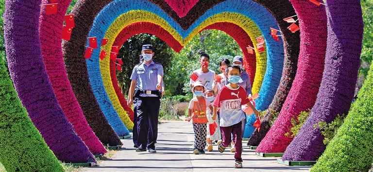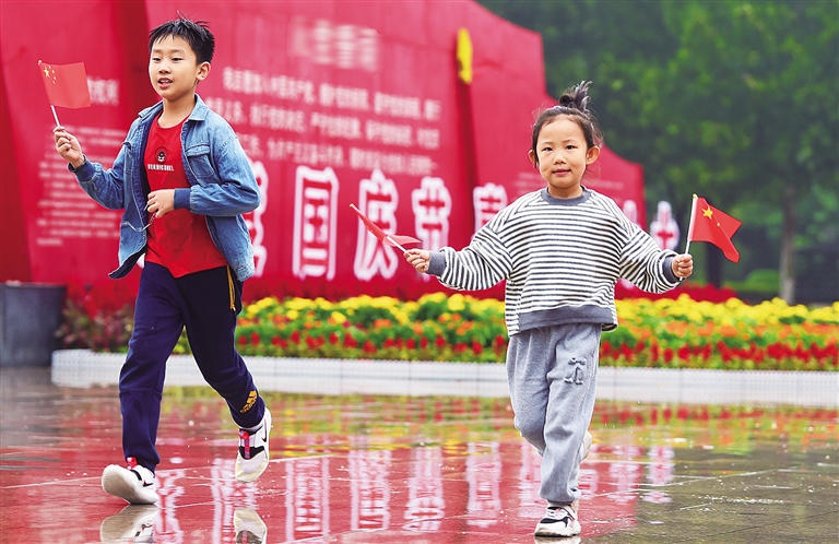 10月3日,河北省邢台市南和区两名小朋友手拿国旗在国庆花坛前快乐奔跑,乐享假日好时光。赵永辉摄(中经视觉)
