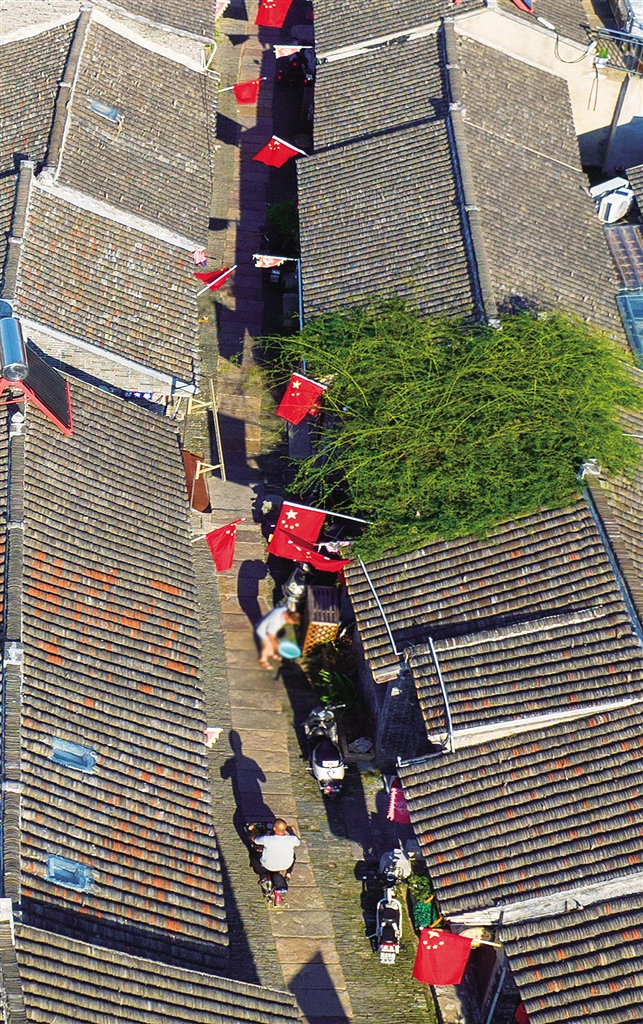 10月3日,江苏省如皋市,游客在挂满国旗的历史文化街区观光旅游。翟慧勇摄(中经视觉)