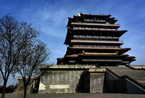 古鹳雀楼,位于山西省永济市蒲州古城西面的黄河岸东,只存世700余年,毁于战火之中。后又因黄河泛滥,河床变址,故址亦淹没不存。直到2002年,重修后的鹳雀楼再次与黄河 “同框”。
