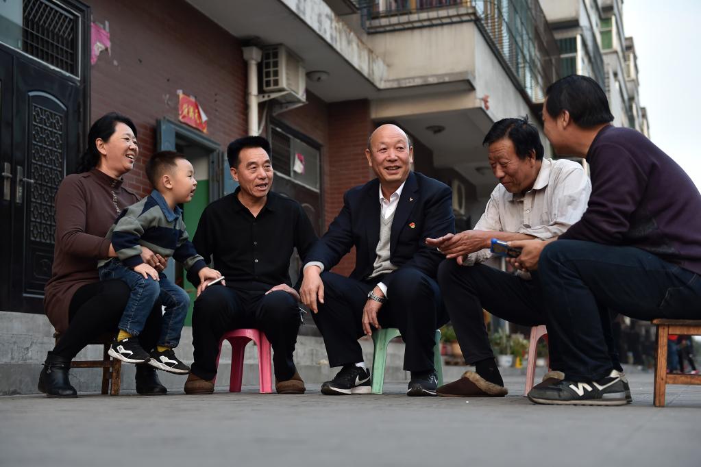 在山西省河津市清涧街道办龙门村,原贵生(右三)和村民聊天。(2017年11月8日摄)。 新华社记者 詹彦 摄