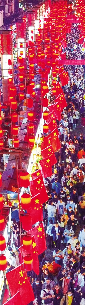 10月2日,河南省洛阳市老城区历史文化街区十字街夜市,鲜艳的国旗、高悬的红灯笼、诱人的美食让市民及游客流连忘返。黄政伟摄(中经视觉)
