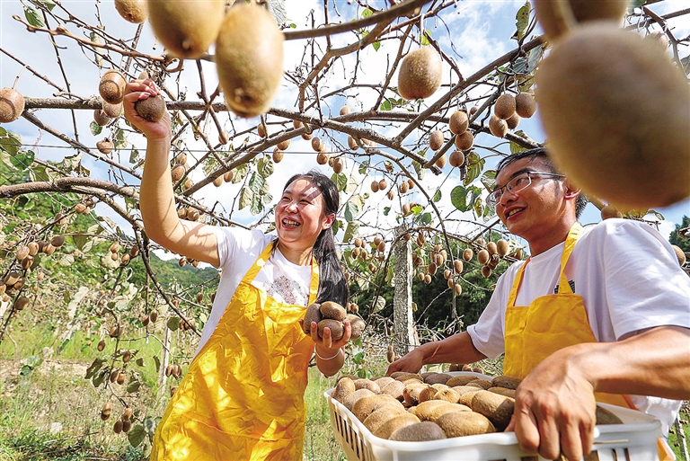 10月3日,果农在贵州省岑巩县平庄镇包东村猕猴桃种植基地忙采摘,抢抓国庆消费季,确保市场供应。胡攀学摄(中经视觉)