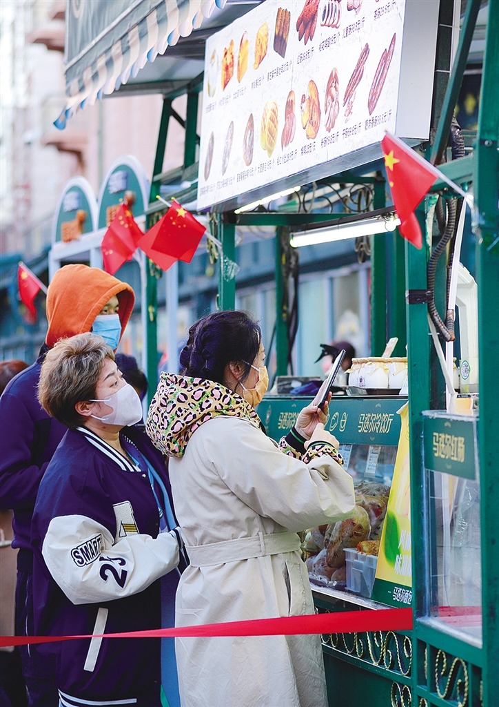 10月4日,在黑龙江省哈尔滨市中央大街,顾客正排队扫码购买当地特产。