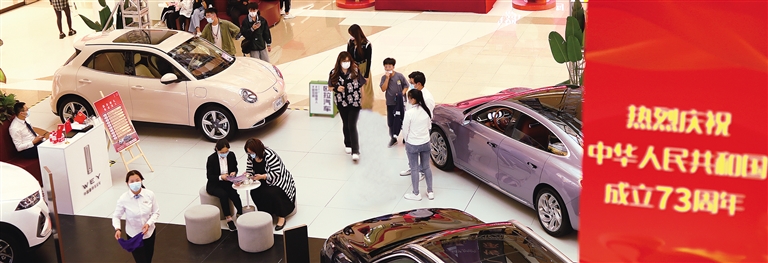 10月4日,顾客在河北省保定市一家汽车展厅看车、选车。国庆假日,该市汽车商家打出促销组合拳,一站式服务让购车者更加满意。崔亚楠摄(中经视觉)