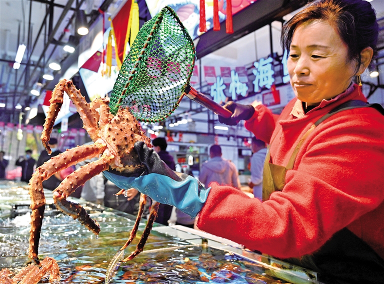10月4日,在山东省日照市东港区石臼海鲜市场,工作人员在给顾客捞帝王蟹。国庆假日,该市海产品货源充足、价格平稳。朱元理摄(中经视觉)