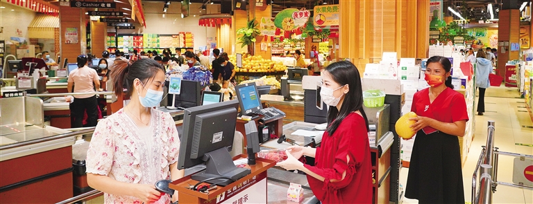 10月4日,江西省龙南市宏昌超市广场店,顾客在收银台排队付款。国庆假日,龙南市多措并举确保市场供应。李林烜摄(中经视觉)