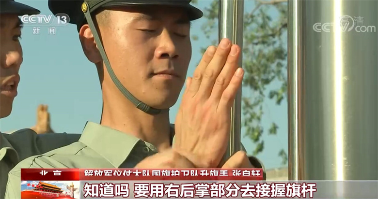 今年十月一日清晨,24岁的升旗手张威身扛国旗,引领着升旗队伍,伴随着雄壮的国歌声,将天安门广场上这面巨型国旗完美展开,顺利完成了他的第一次国庆升旗任务。这个潇洒展旗动作背后是张威日复一日的刻苦训练。