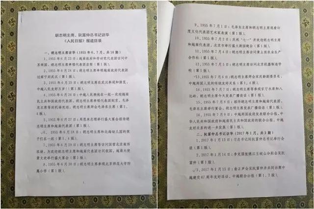 其中,有3期报纸刊登的是阮富仲在2017年1月到访中国的报道。另外16期,习近平介绍说,“这是1955年胡志明主席访华时的报纸,我们费了些劲找到的”。阮富仲听后很惊喜。