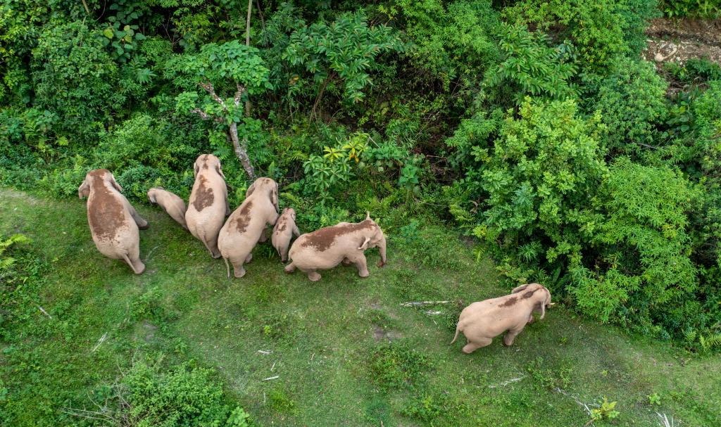 象群在云南省普洱市江城哈尼族彝族自治县山林间觅食(无人机照片,2022年8月1日摄)。新华社记者 江文耀 摄