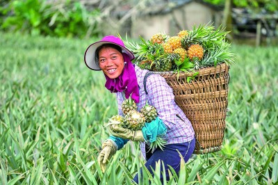 海南省琼海市长坡镇青葛村的农民在采收菠萝。新华社发