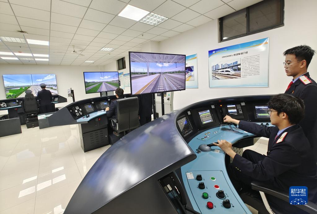 在西安铁路职业技术学院,学生在课堂上进行动车组驾驶与运用实训演练(2022年4月29日摄)。新华社记者 李一博 摄