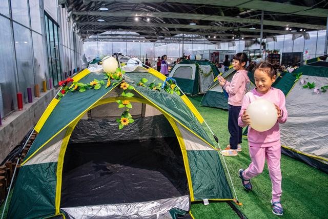 10月5日,小朋友在布置帐篷。