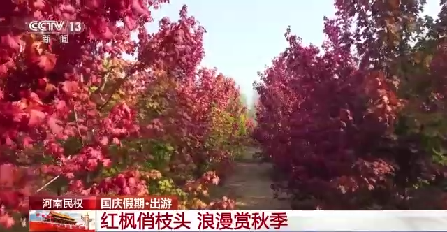 秋色入目,四下皆景,国庆期间,在河南民权县,20000多株红枫正值颜色缤纷、色彩斑斓时期,美不胜收。 伴着微风,红艳艳的红枫仿佛一道道霞光铺满天边,蔚为壮观。在红枫树下,游客们轻抚树枝,同红枫合照,笑声朗朗。