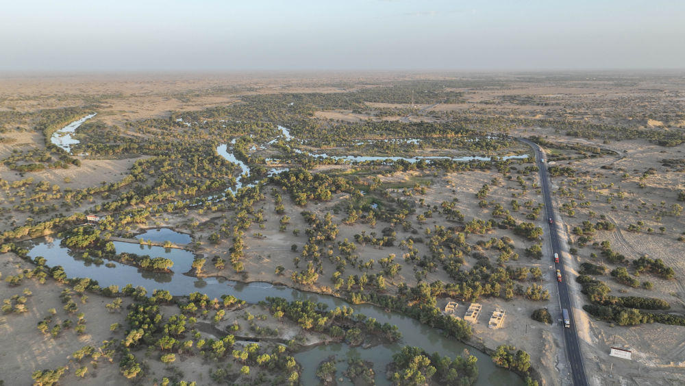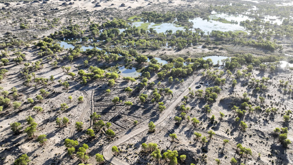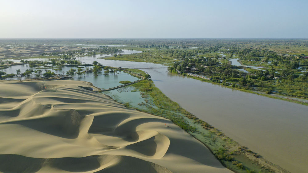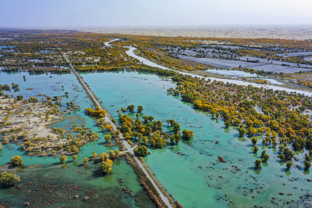 ↑这是2022年8月18日拍摄的塔里木河下游阿拉干断面景象(无人机照片)。生态水滋润两岸胡杨等植被,同时保障交通要道少受风沙侵袭。新华社发(肖玉磊 摄)