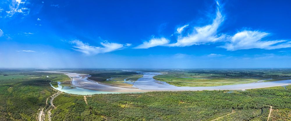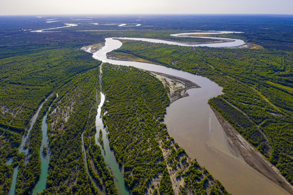 ↑塔里木河流经新疆阿拉尔市(2022年8月2日摄,无人机照片)。新华社发(肖玉磊 摄)
