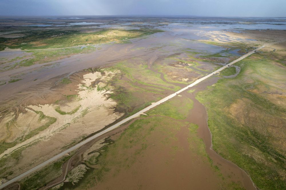 ↑塔里木河流域管理局工作人员在车尔臣河入湖口查看生态水进入台特玛湖情况(2022年7月28日摄,无人机照片)。新华社发(肖玉磊 摄)